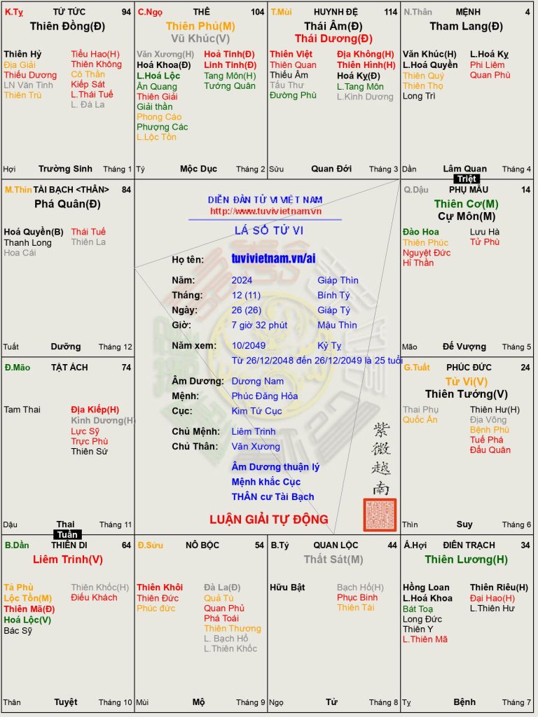Luận giải tử vi trọn đời bằng trí tuệ nhân tạo;